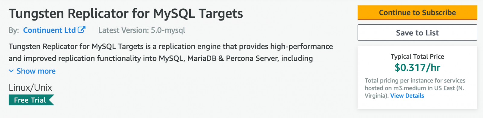 - Choose and Subscribe to the target Tungsten Replicator AMI of your choice.